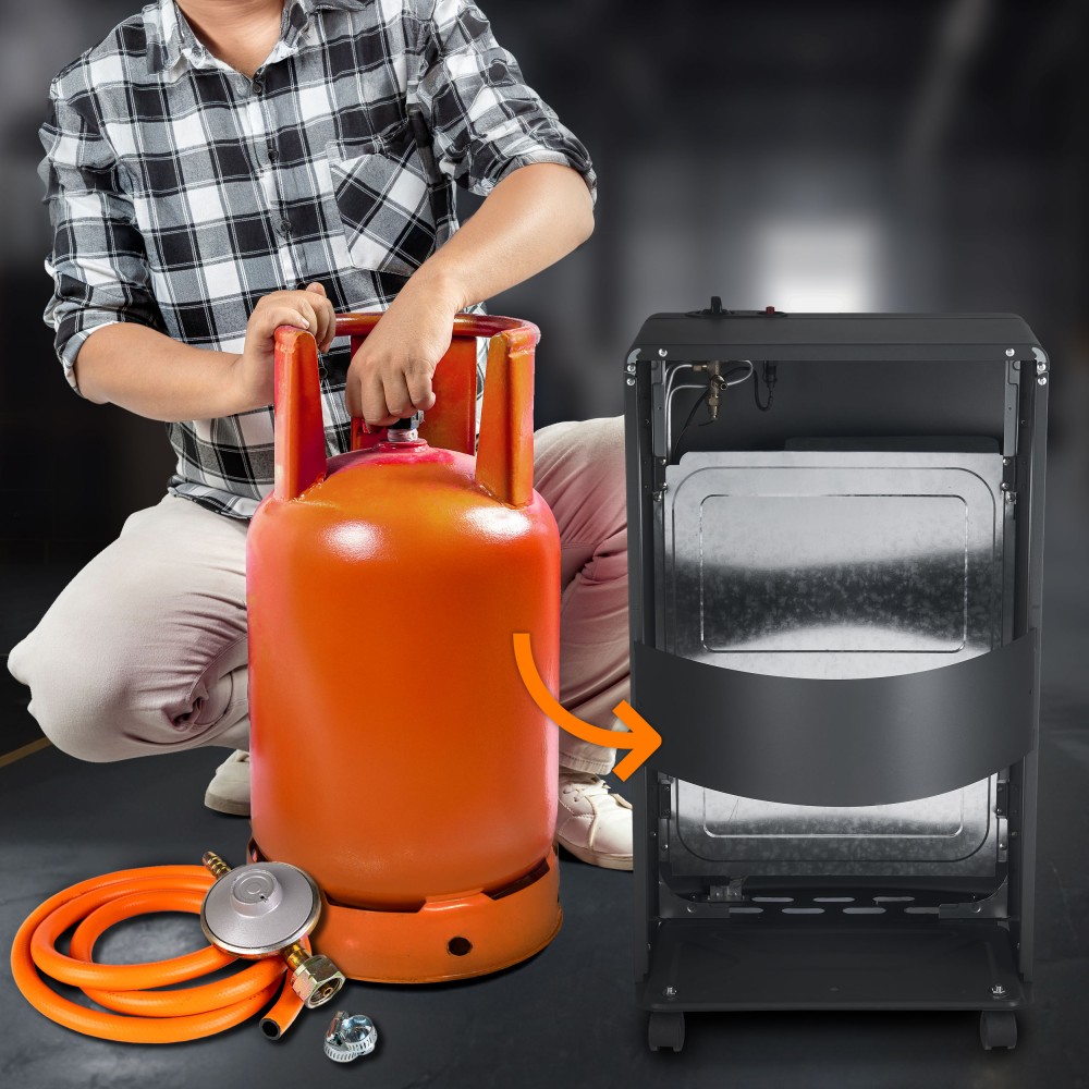 • ✔️ Bezśladowe kółka transportowe – łatwe przesuwanie piecyka bez ryzyka uszkodzenia podłogi, również z zamontowaną butlą